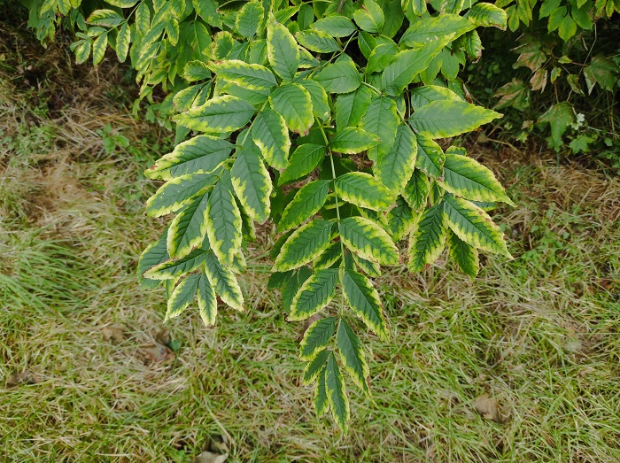 Na první pohled mě zaujaly tyhle jasany se zažloutlými okraji na listech. Loni taky takové byly. Kdyby to byl jen tenhle strom, řekla bych, že je to nějaký mutant, jenže jsem to samé viděla i na javoru o kus dál. Takže si spíš myslím, že jde o nějakou chorobu. Nikde jinde jsem to vlastně neviděla, než na stromech u téhle cesty.